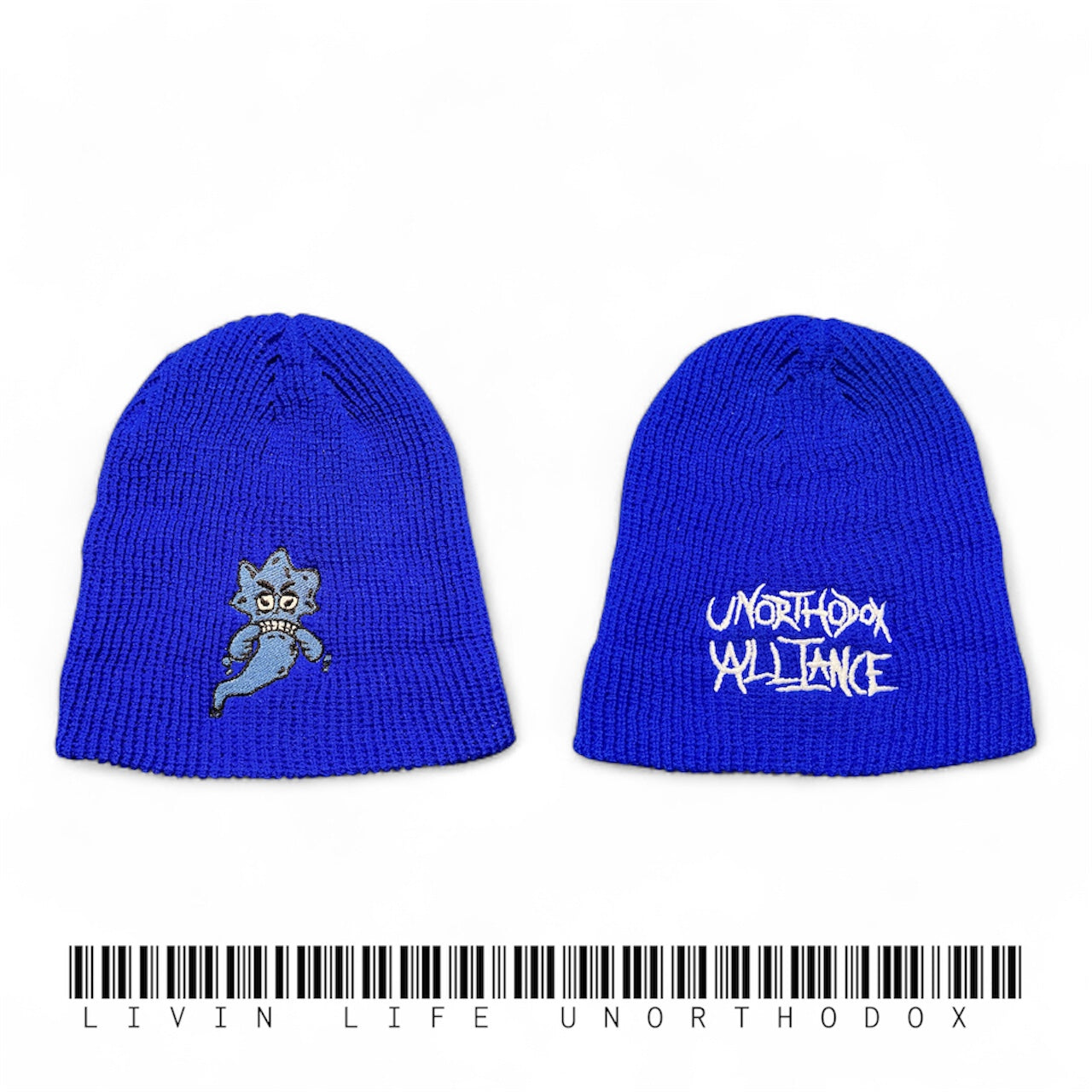 Knit beanie providing comforting warmth with embroidery on the front and back.