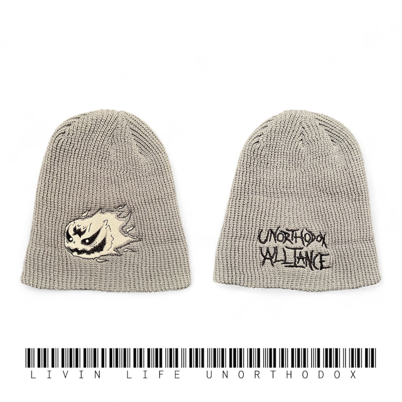 Knit beanie providing comforting warmth with embroidery on the front and back.