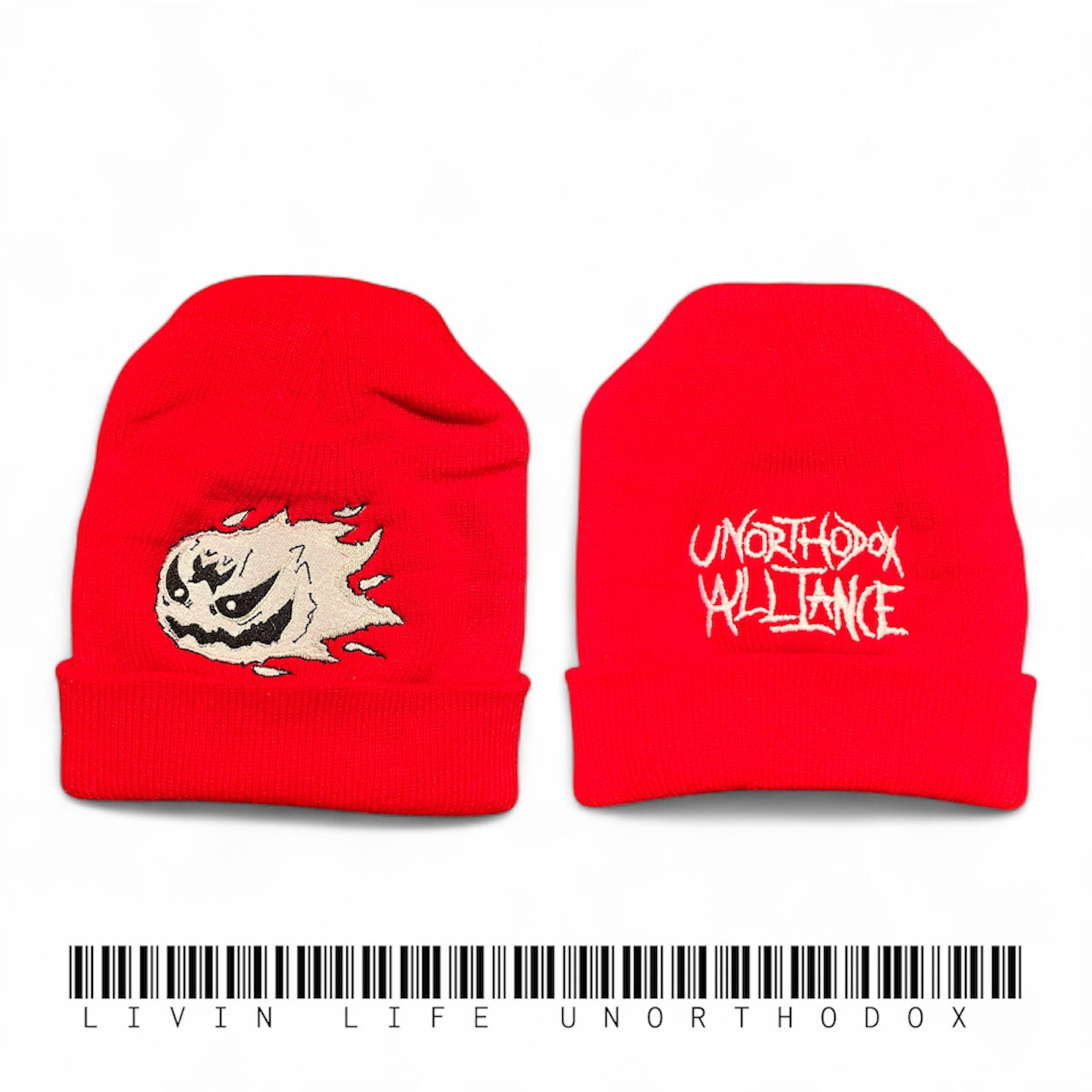 Knit beanie providing comforting warmth with embroidery on the front and back.