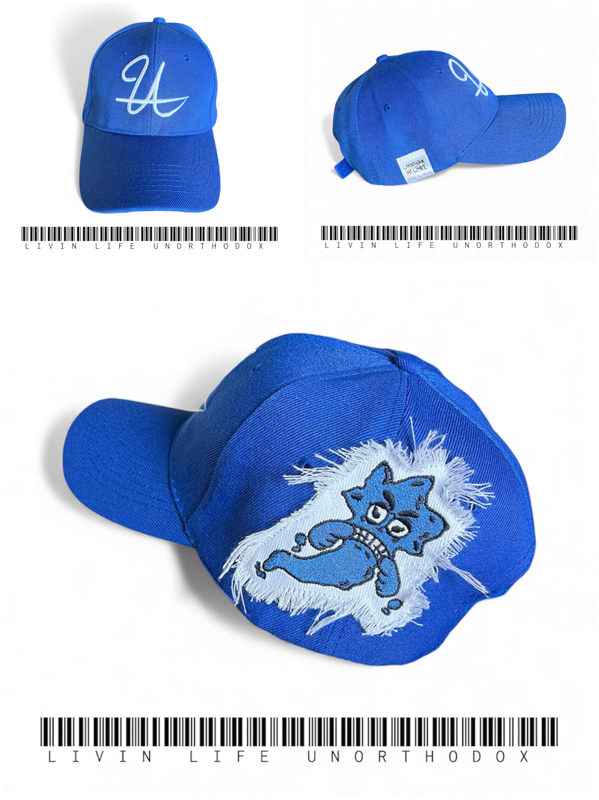 Blue baseball cap with a Unorthodox Alliance symbol on the front and a patch Kutty on the side