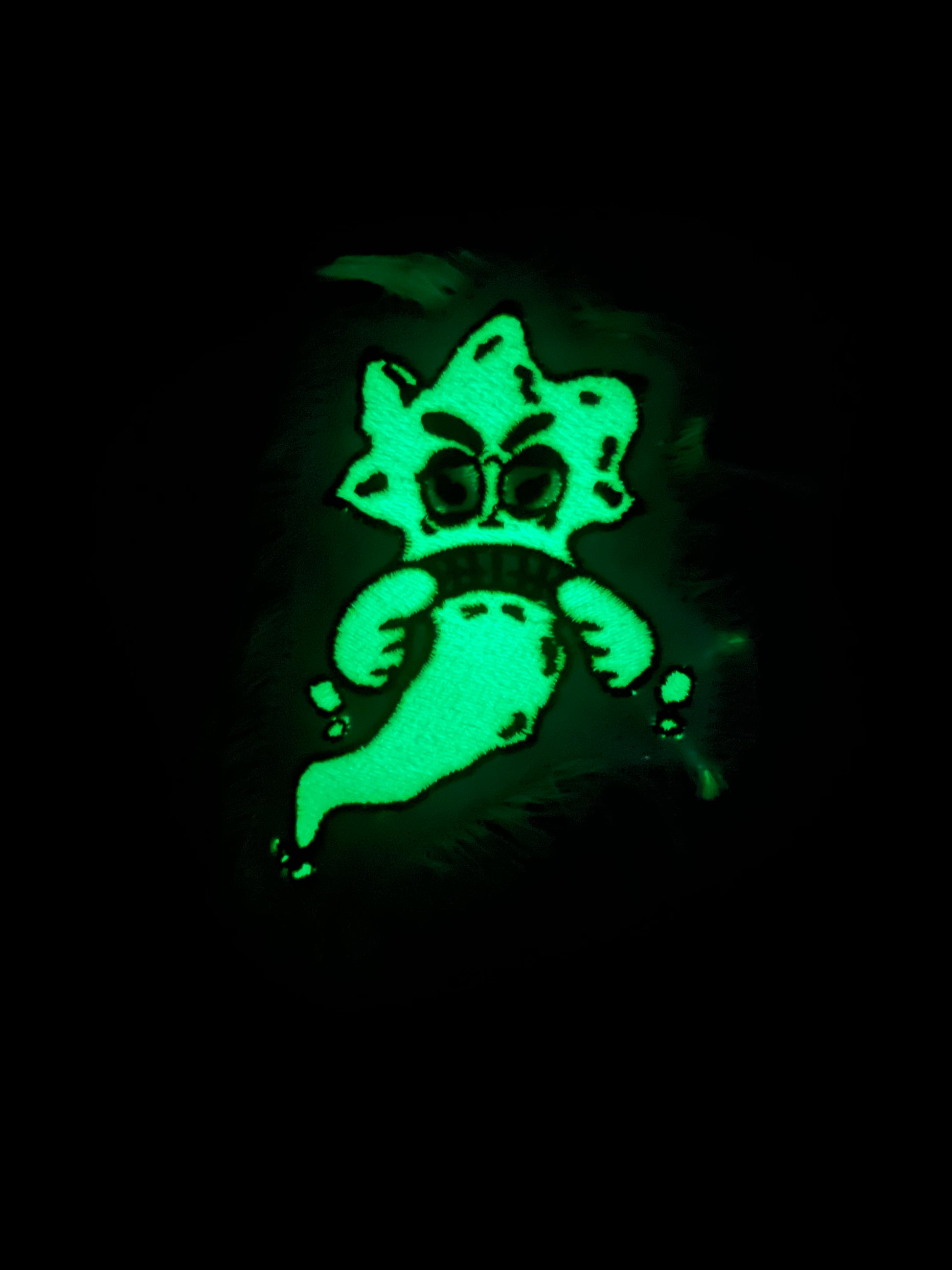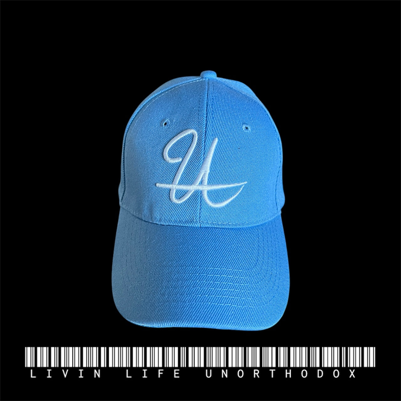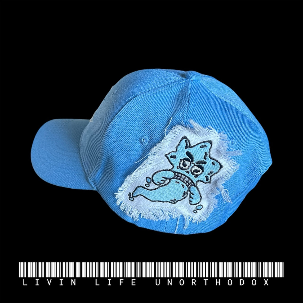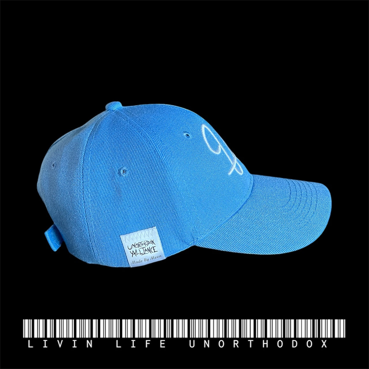 Baby blue baseball cap with a Unorthodox Alliance symbol on the front and a patch Kutty on the side that glows in the dark